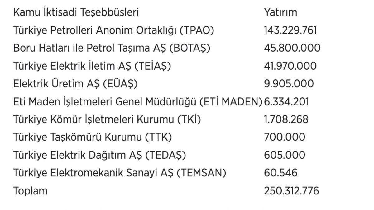 Enerji alanında hizmet veren 9 KİT için toplam yatırım tutarı ise 250 milyar 312 milyon 776 bin lira olarak kayıtlara geçti.