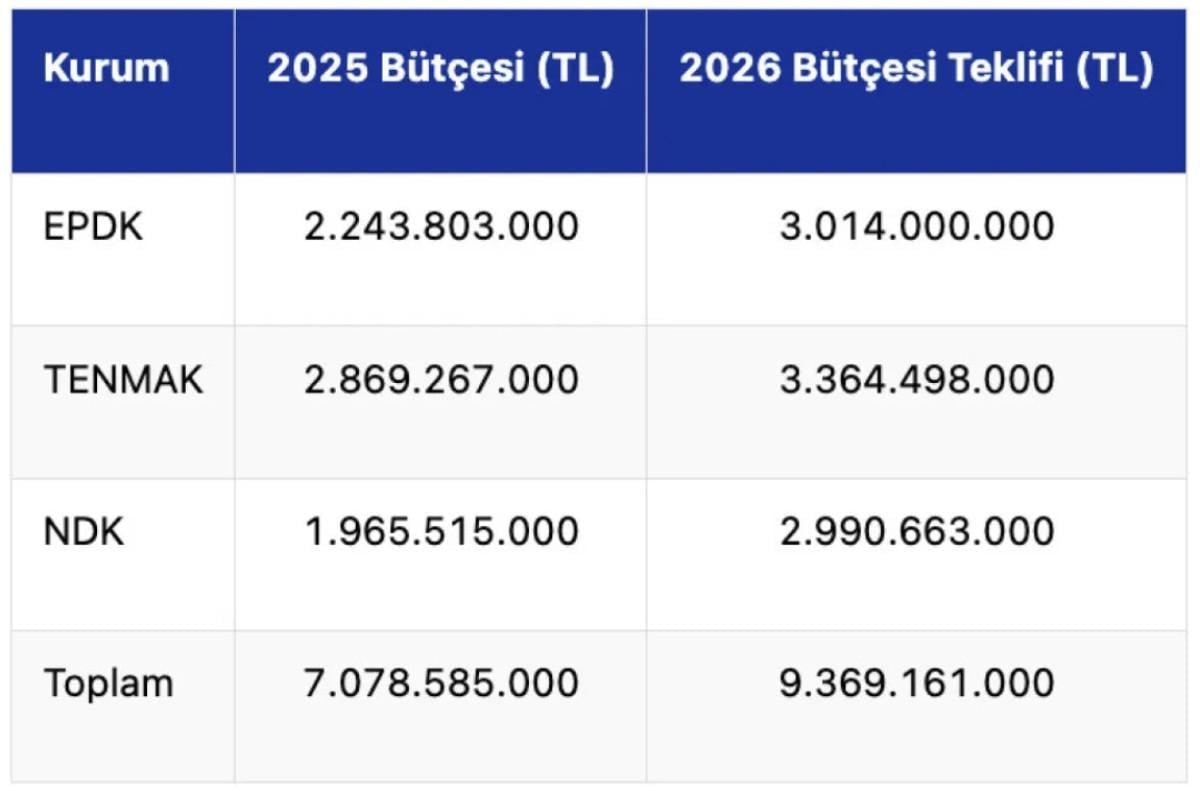 Enerji Piyasası Düzenleme Kurumu (EPDK), Türkiye Enerji, Nükleer ve Maden Araştırma Kurumu (TENMAK) ve Nükleer Düzenleme Kurumu (NDK) için ayrılan kaynak, bu yıla göre yüzde 32,3 artışla yaklaşık 9,4 milyar liraya yükseldi.