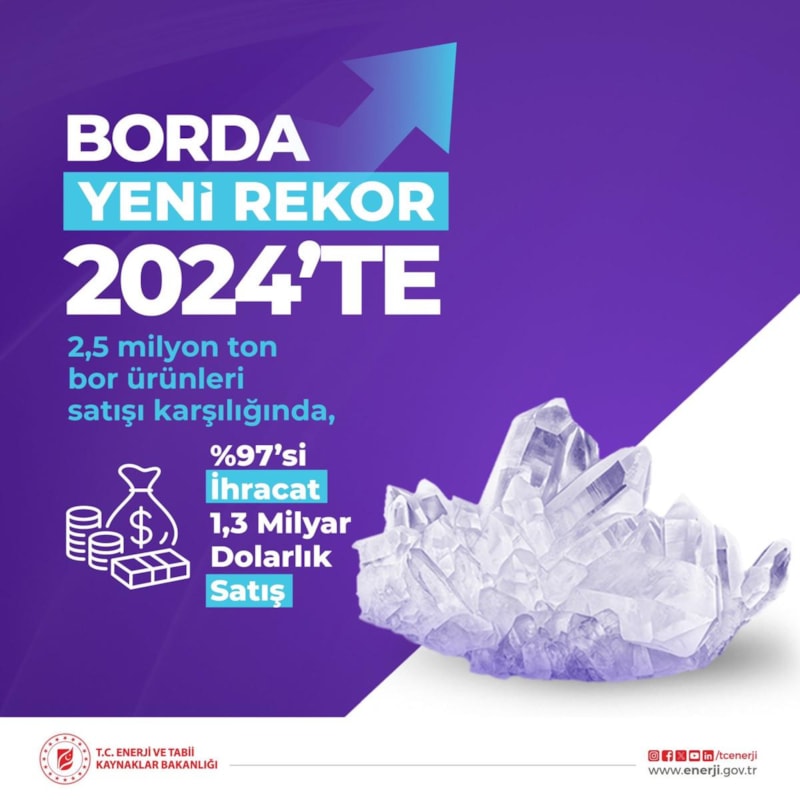 Enerji ve Tabii Kaynaklar Bakanlığı, infografikli paylaşımında, Türkiye’nin bor rezervindeki dünyadaki konumunu ve 2024 yılında bordan gerçekleştirilen satışı açıklayarak şu ifadeleri kullandı: