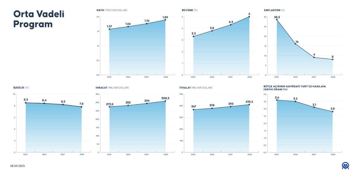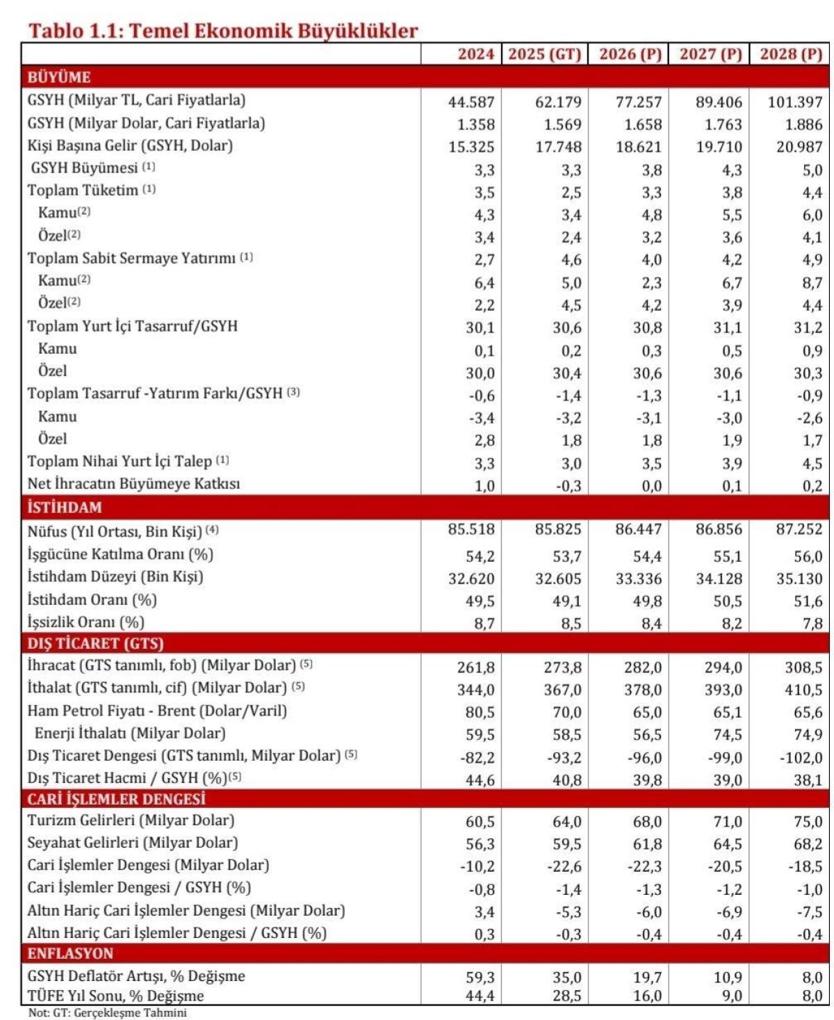 2026-2028 Orta Vadile Program (OVP) dönemi sonunda milli gelir 1,9 trilyon dolara yaklaşacak, kişi başına düşen gelir 21 bin dolara çıkacak, ihracat 300 milyar doları aşacak, turizm gelirleri 75 milyar dolara ulaşacak, 2,5 milyon ilave istihdam sağlanacak ve işsizlik yüzde 8’in altına inecek, tek haneli enflasyonla kalıcı fiyat istikrarı tesis edilecek.