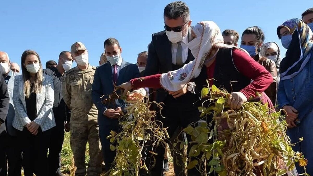 Erzurum Valisi Okay Memiş, İspir Hanımeli Kadın Kooperatifince ilçeye yaklaşık 5 kilometre uzaklıktaki 100 dönümlük arazide üretilen fasulyelerin hasadına katıldı.