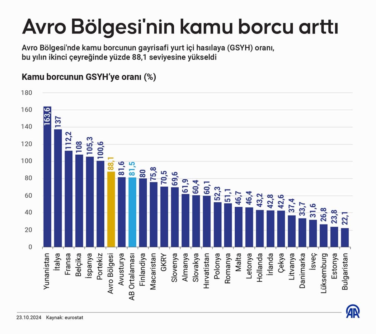 AB üyesi ülkeler arasında yılın ikinci çeyreğinde kamu borcunun GSYH'ye oranının en fazla olduğu ülke, yüzde 163,6 ile Yunanistan oldu. Yunanistan'ı, yüzde 137 ile İtalya, yüzde 112,2 ile Fransa, yüzde 108 ile Belçika, yüzde 105,3 ile İspanya ve yüzde 100,6 ile Portekiz izledi.
