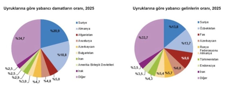 Yabancı damatlar uyruklarına göre incelendiğinde, yabancı damatlar içinde yüzde 20,9 ile Suriyeli damatlar birinci sırada yer aldı. Suriyeli damatları yüzde 18,8 ile Alman damatlar ve yüzde 5 ile Afgan damatlar izledi.