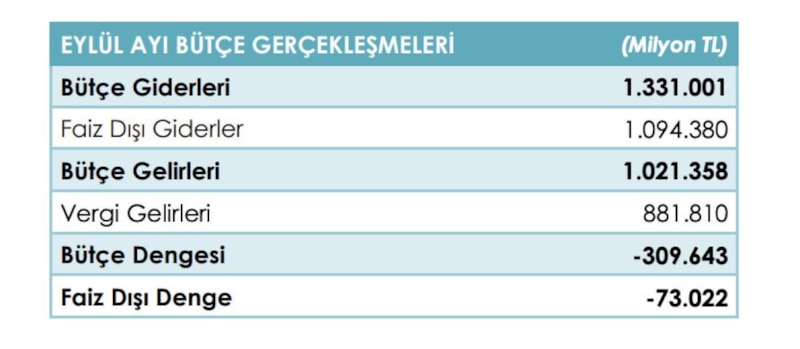 Buna göre, 2025 yılı Eylül ayında merkezi yönetim bütçe giderleri 1 trilyon 331 milyar TL, bütçe gelirleri 1 trilyon 21,4 milyar TL ve bütçe açığı 309,6 milyar TL olarak gerçekleşti.