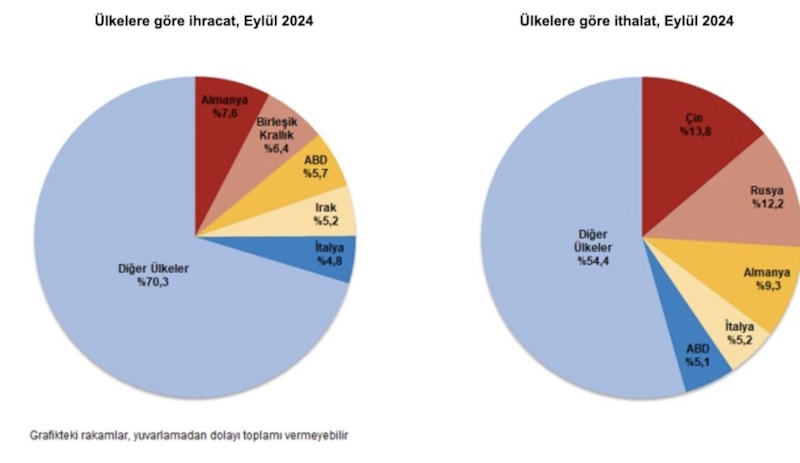 Eylülde ithalatta ilk sırayı Çin aldı. Çin'den yapılan ithalat tutarı 3 milyar 737 milyon dolar olarak hesaplanırken, bu ülkeyi sırasıyla 3 milyar 304 milyon dolarla Rusya, 2 milyar 521 milyon dolarla Almanya, 1 milyar 412 milyon dolarla İtalya, 1 milyar 392 milyon dolarla ABD takip etti. İlk 5 ülkeden yapılan ithalat, toplam ithalatın yüzde 45,6'sını oluşturdu.