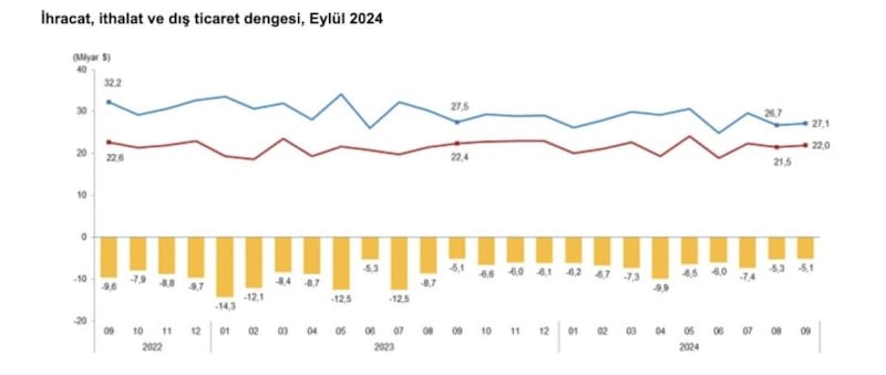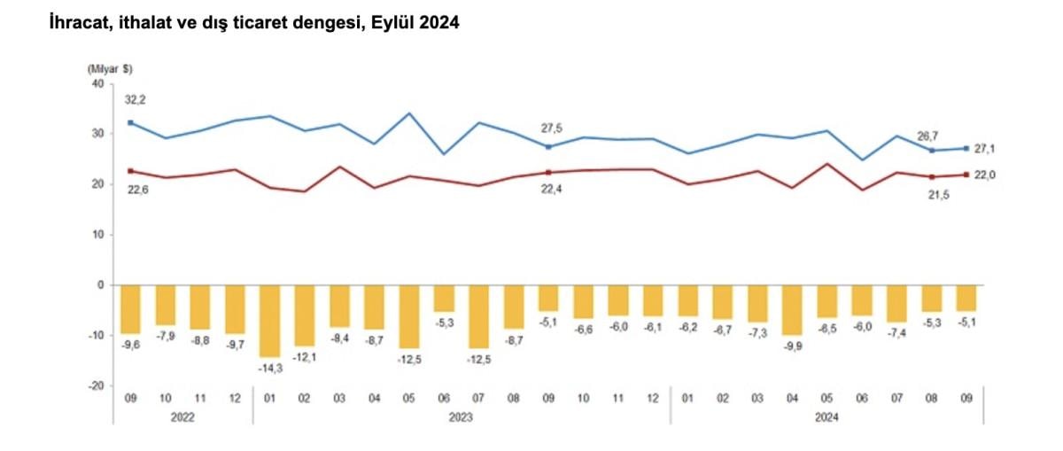 Türkiye'nin ihracatı, eylülde geçen yılın aynı ayına göre yüzde 1,9 azalışla 21 milyar 987 milyon dolar, ithalatı ise yüzde 1,4 düşüşle 27 milyar 116 milyon dolar olarak gerçekleşti.