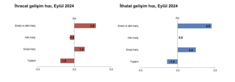 Mevsim ve takvim etkilerinden arındırılmış seriye göre, eylülde bir önceki aya kıyasla ihracat yüzde 1,2 azalırken, ithalat yüzde 1 artış gösterdi. Takvim etkilerinden arındırılmış seriye göre ise eylülde geçen yılın aynı ayına göre ihracat yüzde 1,2, ithalat yüzde 1,4 azaldı.