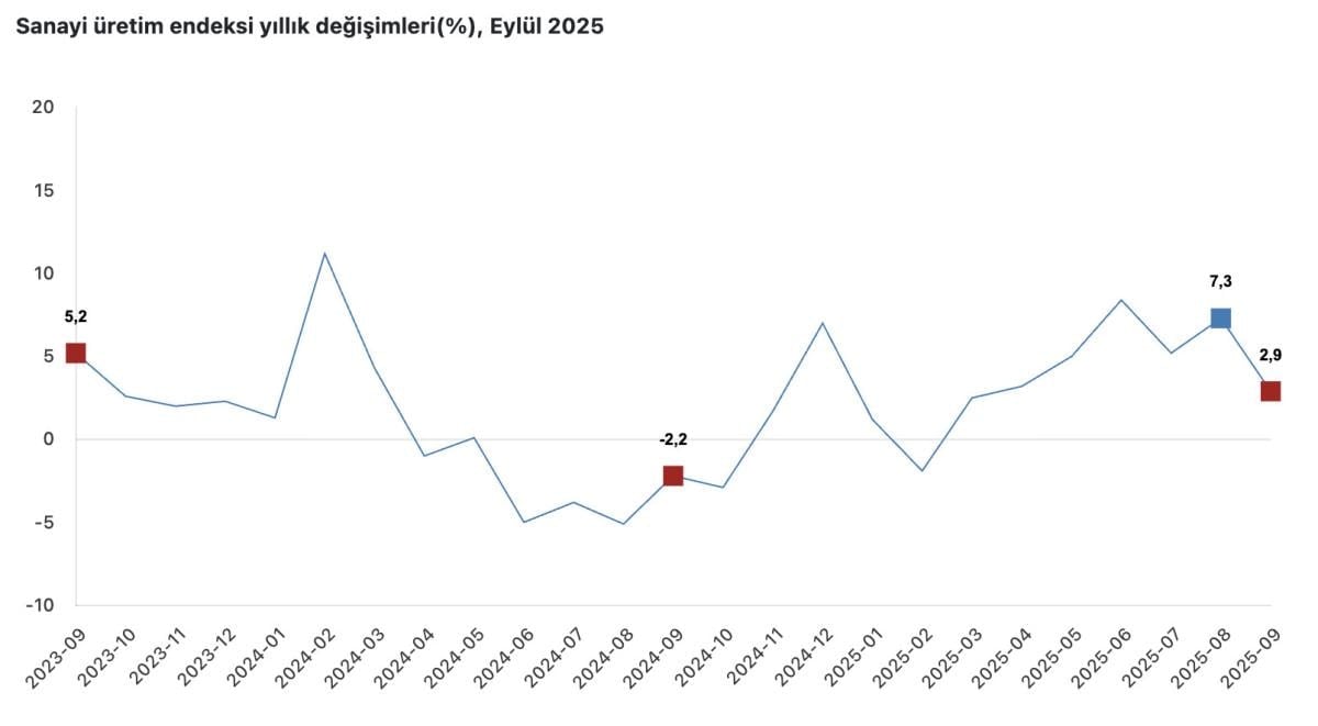 - TÜİK verilerine göre, Eylül 2025'te sanayi üretimi yıllık bazda yüzde 2,9 arttı.