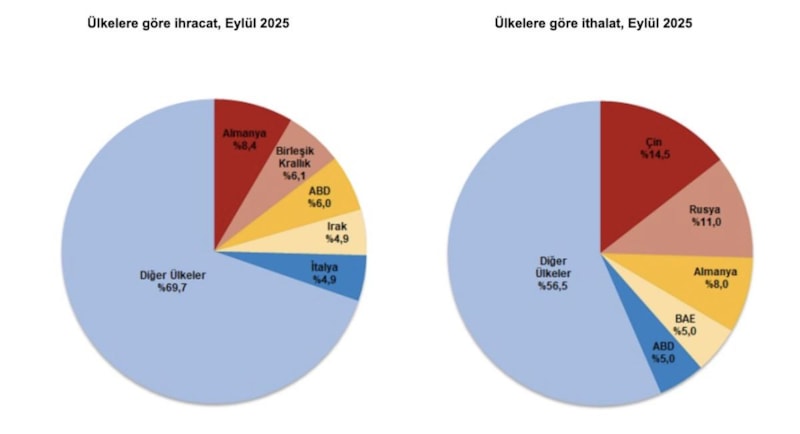 İthalatta Çin ilk sırayı aldı. Eylül ayında Çin'den yapılan ithalat 4 milyar 264 milyon dolar olurken bu ülkeyi sırasıyla; 3 milyar 247 milyon dolar ile Rusya Federasyonu, 2 milyar 363 milyon dolar ile Almanya, 1 milyar 485 milyon dolar ile Birleşik Arap Emirlikleri, 1 milyar 465 milyon dolar ile ABD izledi. İlk 5 ülkeden yapılan ithalat, toplam ithalatın yüzde 43,5'ini oluşturdu.