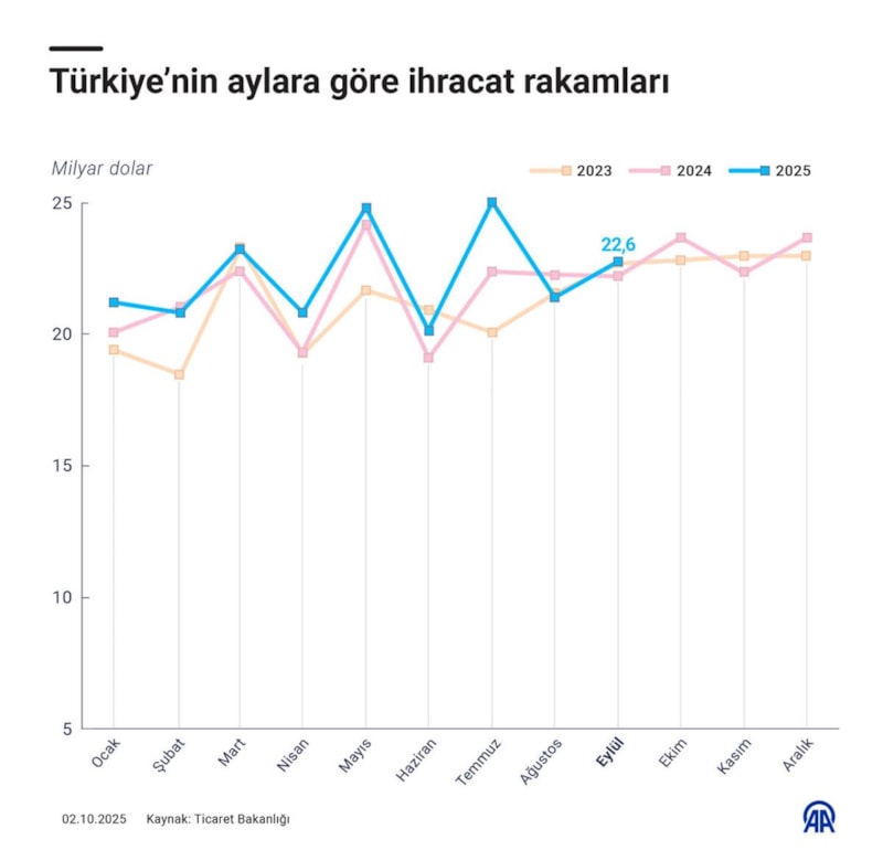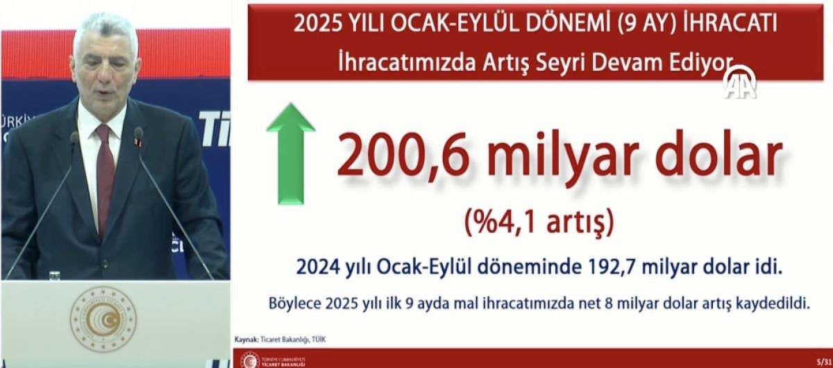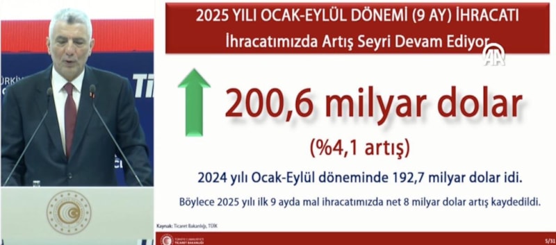 2025 yılı ocak-eylül dönemi ihracatında artış seyri devam etti ve yüzde 4,1 artışla 200,6 milyar dolara ulaştı.
