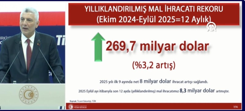 12 aylık yılıklandırılmış ihracat ise yüzde 3,2 artışla 269,7 milyar dolara çıktı. Böylece 2025 yılı ilk 9 ayda mal ihracatımızda net 8 milyar dolar artış kaydedildi.
