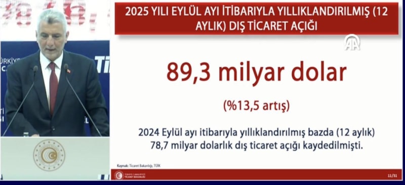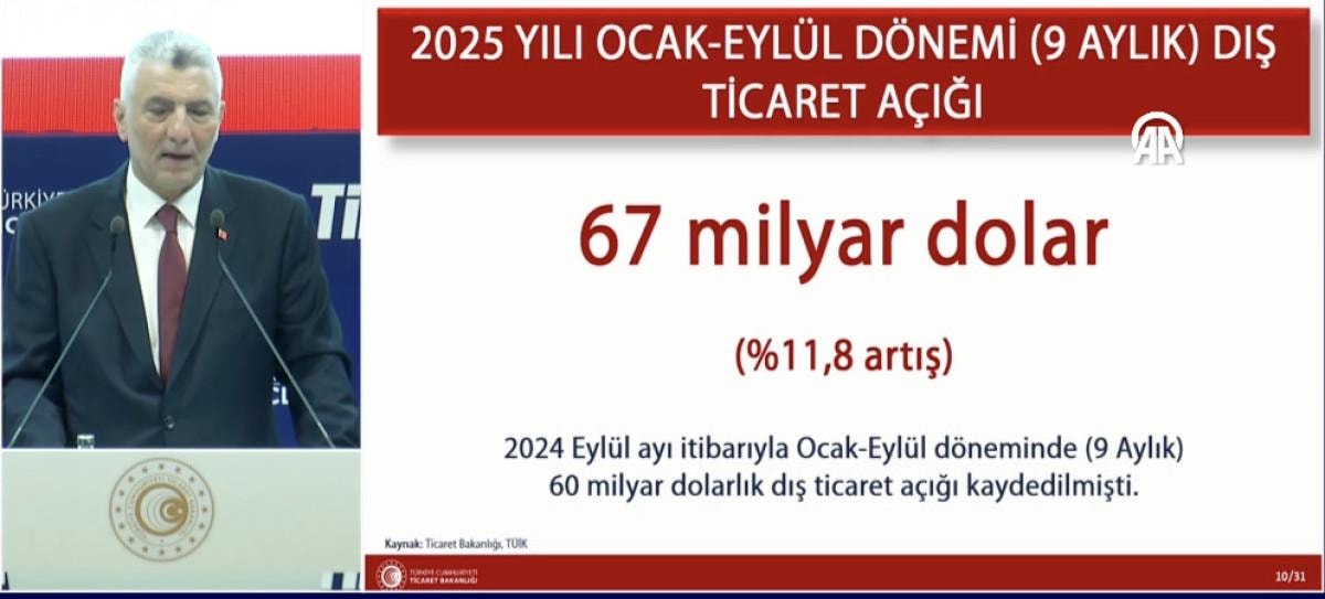 Eylül ayında dış ticaret açığı yüzde 33,4 artarak 6,9 milyar dolar oldu. 2025 yılının Ocak-Eylül döneminde ise dış ticaret açığı yüzde 11,8 artışla 67 milyar dolar oldu. 2025 yılı Eylül ayı itibarıyla yıllıklandırılmış dış ticaret açığı, yüzde 13,5 artışla 89,3 milyar dolar oldu.