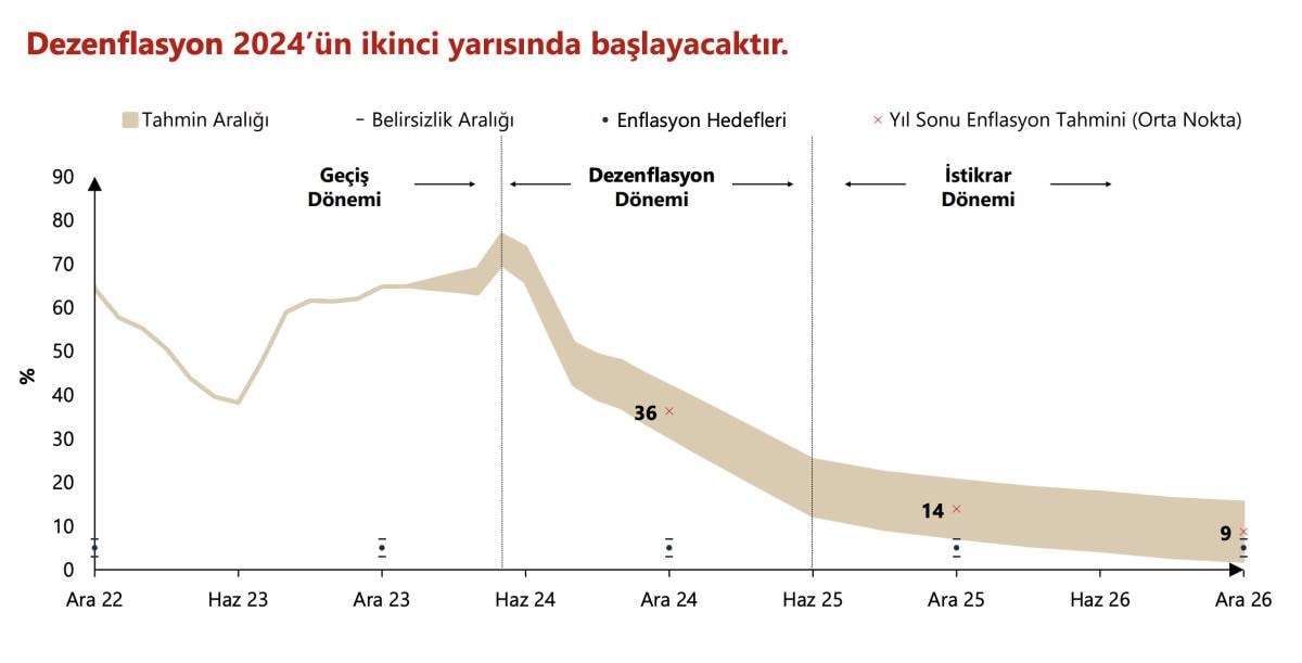 TCMB Başkanı Karahan'ın açıkladığı enflasyon tahminlerinin orta noktası; 2024 yıl sonu için yüzde 36, 2025 yıl sonu için yüzde 14 ve 2026 için yüzde 9 oldu.