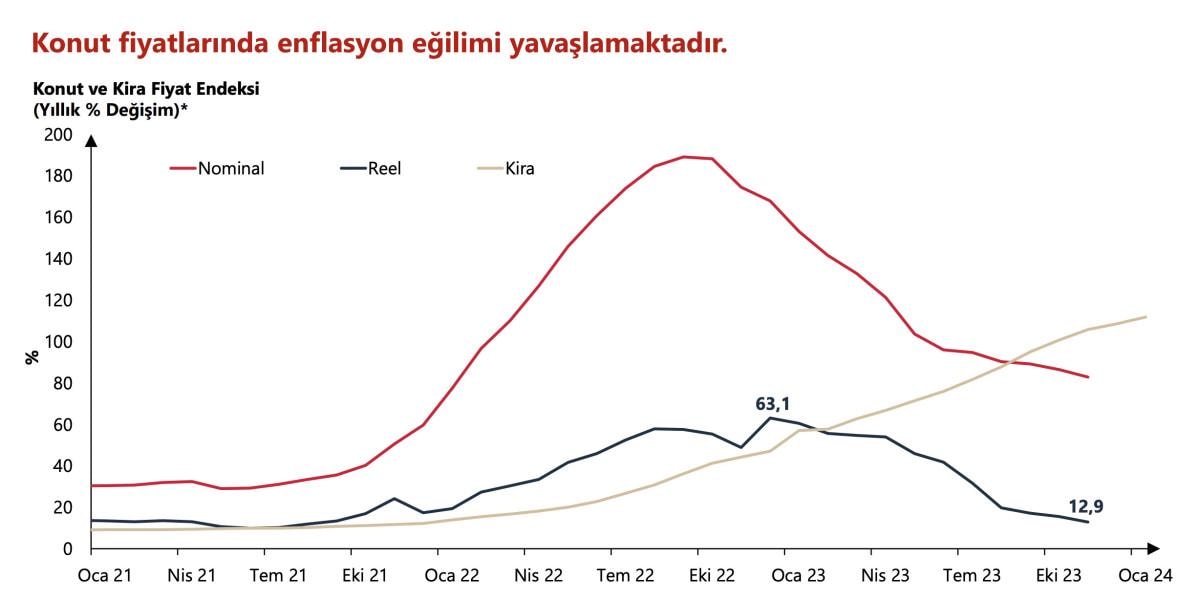 Konut fiyat artışındaki yavaşlamanın sürmesi, kira ve dolayısıyla hizmet enflasyonu kanalıyla, 2024 yılında dezenflasyon sürecine katkı sağlayacaktır.