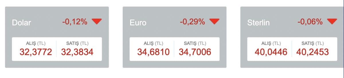 Dolar yüzde 0,12 düşüşle 32,3834 lirada, euro yüzde 0,29 düşüşle 34,7006 lirada ve sterlin ise yüzde 0,06 inişle 40,2453 liradan işlem görüyor.