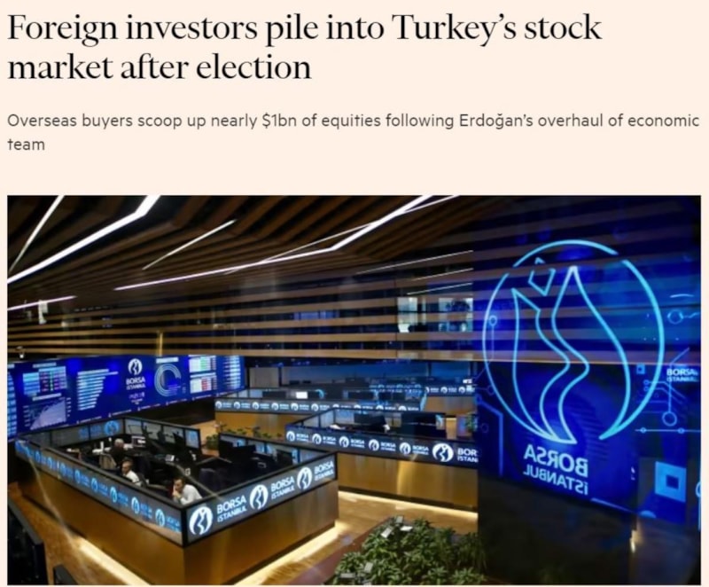 "Yabancı yatırımcılar seçimin ardından Türkiye borsasına akın ediyor" başlıklı haberde, yurt dışı alıcıların, Erdoğan'ın ekonomi ekibini yeniden kurmasının ardından yaklaşık 1 milyar dolarlık hisse senedi aldığı belirtildi.