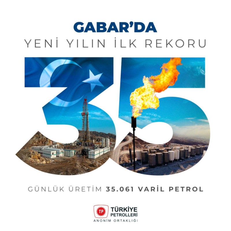 Türkiye Petrolleri Anonim Ortaklığı (TPAO), Gabar'da günlük petrol üretiminde 35 bin varilin üzerine çıkarak rekor kırdı.