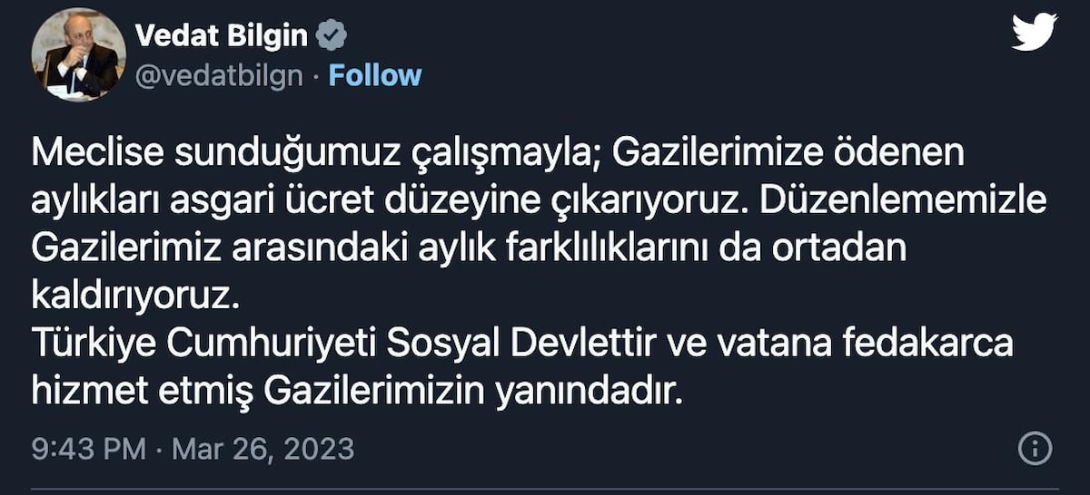 Bilgin, sosyal medya hesabından yaptığı paylaşımda, "Meclis'e sunduğumuz çalışmayla gazilerimize ödenen aylıkları asgari ücret düzeyine çıkarıyoruz. Düzenlememizle gazilerimiz arasındaki aylık farklılıklarını da ortadan kaldırıyoruz. Türkiye Cumhuriyeti sosyal devlettir ve vatana fedakarca hizmet etmiş gazilerimizin yanındadır." ifadelerini kullandı.