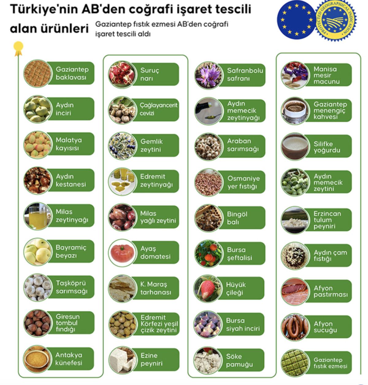 Gaziantep baklavası, Aydın inciriMalatya kayısısı, Aydın kestanesi, Milas zeytinyağı, Bayramiç beyazı, Taşköprü sarımsağı, Giresun tombul fındığı, Antakya künefesi, Suruç narı, Çağlayancerit cevizi, Gemlik zeytini, Edremit zeytinyağı, Milas yağlı zeytini, Ayaş domatesi, Maraş tarhanası, Edremit Körfezi yeşil çizik zeytini, Ezine peyniri, Safranbolu safranı, Aydın memecik zeytinyağı, Araban sarımsağı, Osmaniye yer fıstığı, Bingöl balı, Bursa şeftalisi, Hüyük çileği, Bursa siyah inciri, Söke pamuğu, Manisa mesir macunu, Gaziantep menengiç kahvesi, Silifke yoğurdu, Aydın memecik zeytini, Erzincan tulum peyniri, Aydın çam fıstığı, Afyon pastırması, Afyon sucuğu, Gaziantep fıstık ezmesi.