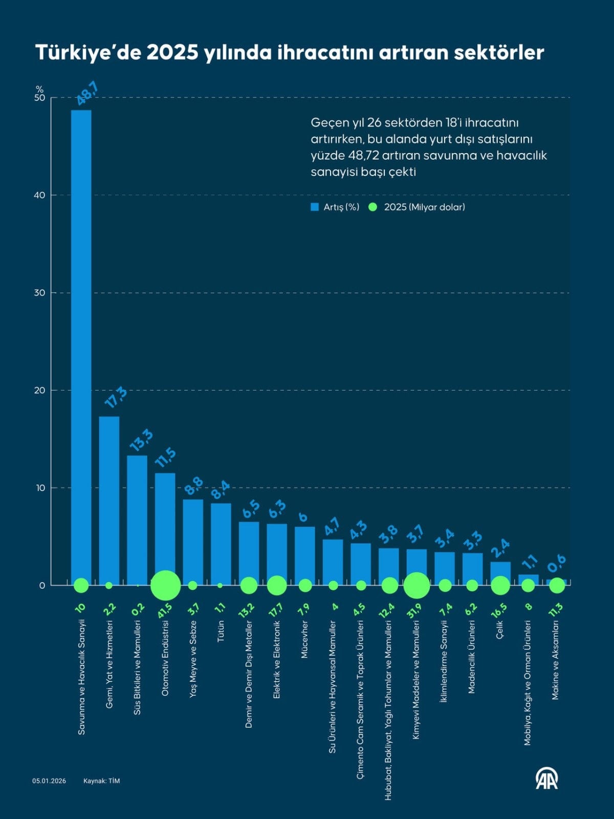 - Türkiye'de geçen yıl 26 sektörden 18'i ihracatını artırdı, savunma ve havacılık sanayisi yüzde 48,72'lik artışla lider oldu.