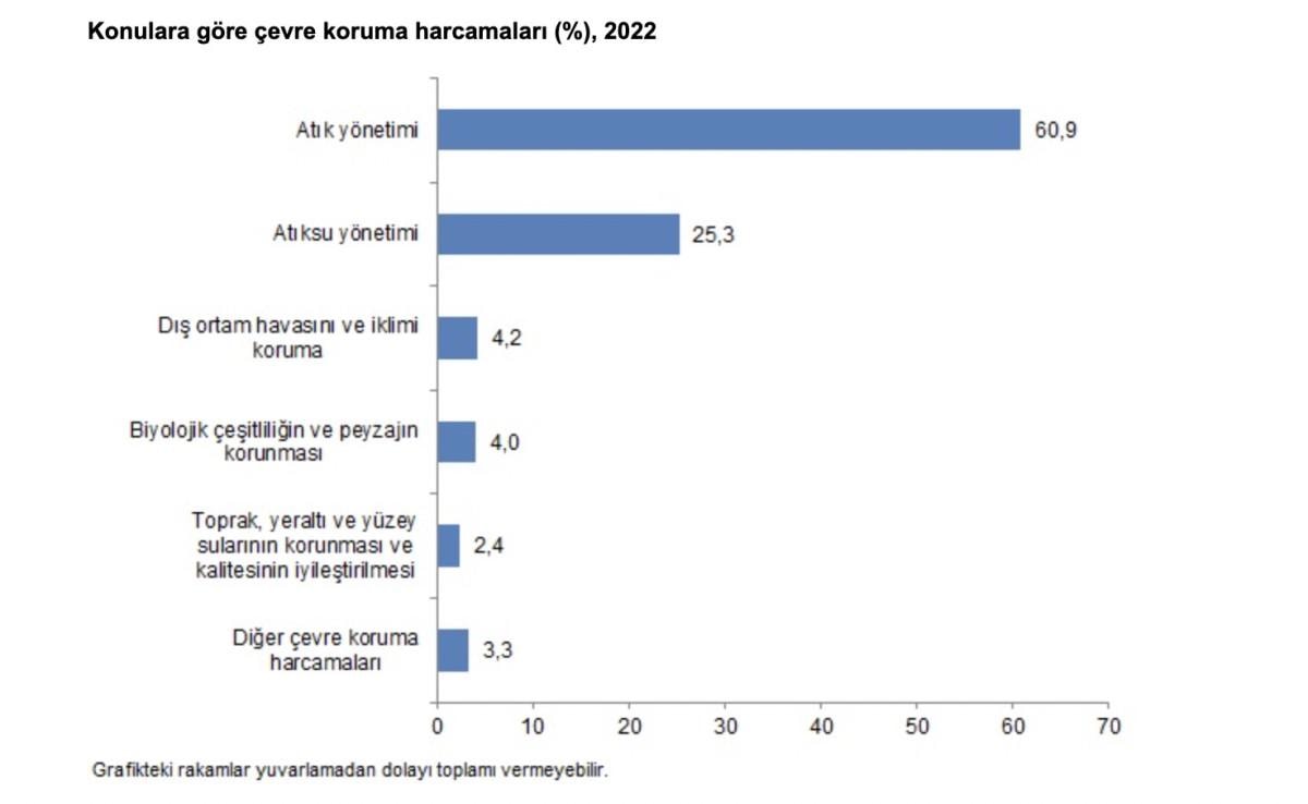 Çevre koruma harcamalarının yüzde 60,9'u atık yönetimi hizmetlerinden, yüzde 25,3'ü atıksu yönetimi hizmetlerinden, yüzde 4,2'si dış ortam havasını ve iklimi korumadan, yüzde 4'ü biyolojik çeşitliliğin ve peyzajın korunmasından, yüzde 2,4'ü toprak, yeraltı ve yüzey sularının korunması ve kalitesinin iyileştirilmesinden ve yüzde 3,3'ü ise diğer çevre koruma konularından oluştu.