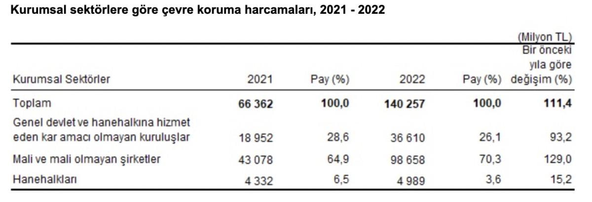 Bir önceki yıla göre yüzde 140,9 artarak toplam 32,7 milyar TL olarak gerçekleşen çevre koruma yatırım harcamalarının yüzde 84,7'si mali ve mali olmayan şirketler, yüzde 15,3'ü ise genel devlet ve hanehalkına hizmet eden kar amacı olmayan kuruluşlar tarafından yapıldı.