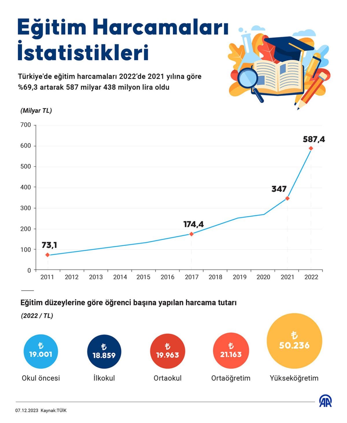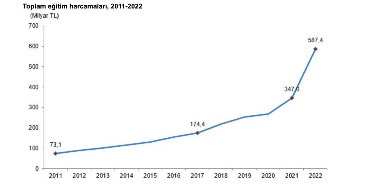 Eğitim harcamaları 2022 yılında 2021 yılına göre yüzde 69,3 artarak 587 milyar 438 milyon TL oldu. 2022 yılında bir önceki yıla göre eğitim harcamalarının en fazla arttığı eğitim düzeyleri; yüzde 113,8 ile okul öncesi ve yüzde 74,1 ile yükseköğretim oldu.