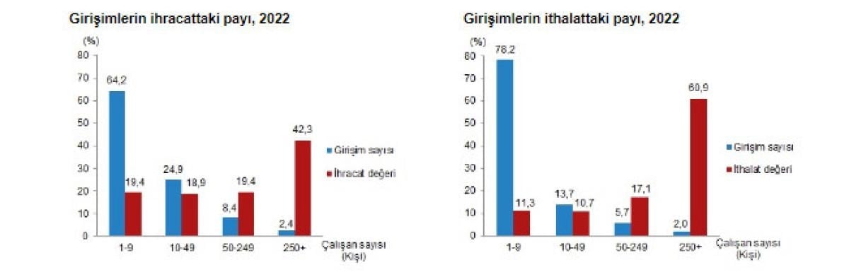 Dış ticaret istatistikleri ve iş kayıtları sistemi kullanılarak elde edilen verilere göre, 2022 yılında 114 bin 155 girişim ihracat, 173 bin 302 girişim ithalat yaptı.