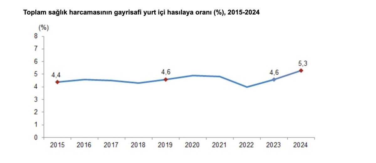 Toplam sağlık harcamasının GSYH'ye oranı 2023 yılında yüzde 4,6 iken, 2024 yılında yüzde 5,3 oldu. Cari sağlık harcamasının GSYH'ye oranı 2023 yılında yüzde 4,2, 2024 yılında yüzde 4,9 olarak hesaplandı.