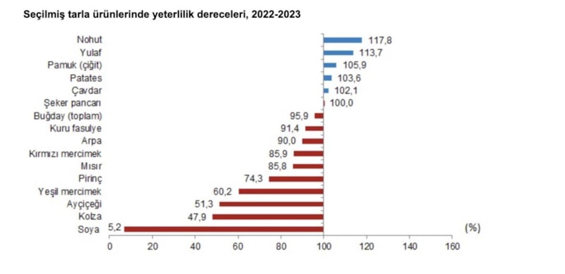 Toplam tahıl üretiminde en büyük paya sahip olan buğdayın yeterlilik derecesi yüzde 95,9 (durum buğdayında yüzde 181, diğer buğdayda yüzde 86,4), yem sanayinin en önemli girdilerini oluşturan arpanın yeterlilik derecesi yüzde 90, mısırın yeterlilik derecesi yüzde 85,8, soyanın yeterlilik derecesi ise yüzde 5,2 olarak gerçekleşti.