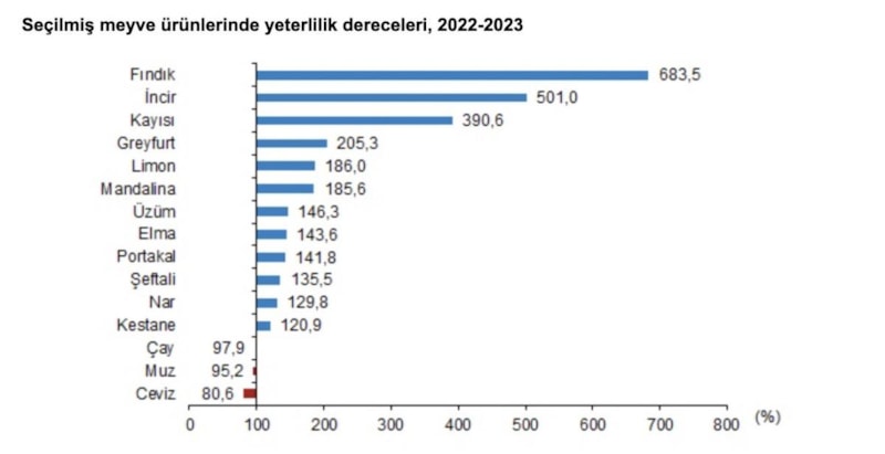 TÜİK verilerine göre, bitkisel ürünlerde en yüksek yeterlilik derecesi yüzde 683,5 ile fındıkta gerçekleşti.