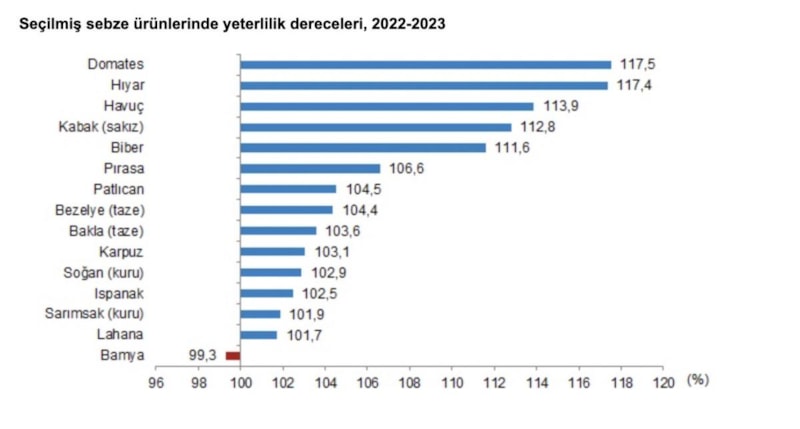 Sebzelerde en yüksek yeterlilik dereceleri domateste yüzde 117,5, hıyarda yüzde 117,4, havuçta ise yüzde 113,9 olarak gerçekleşti.