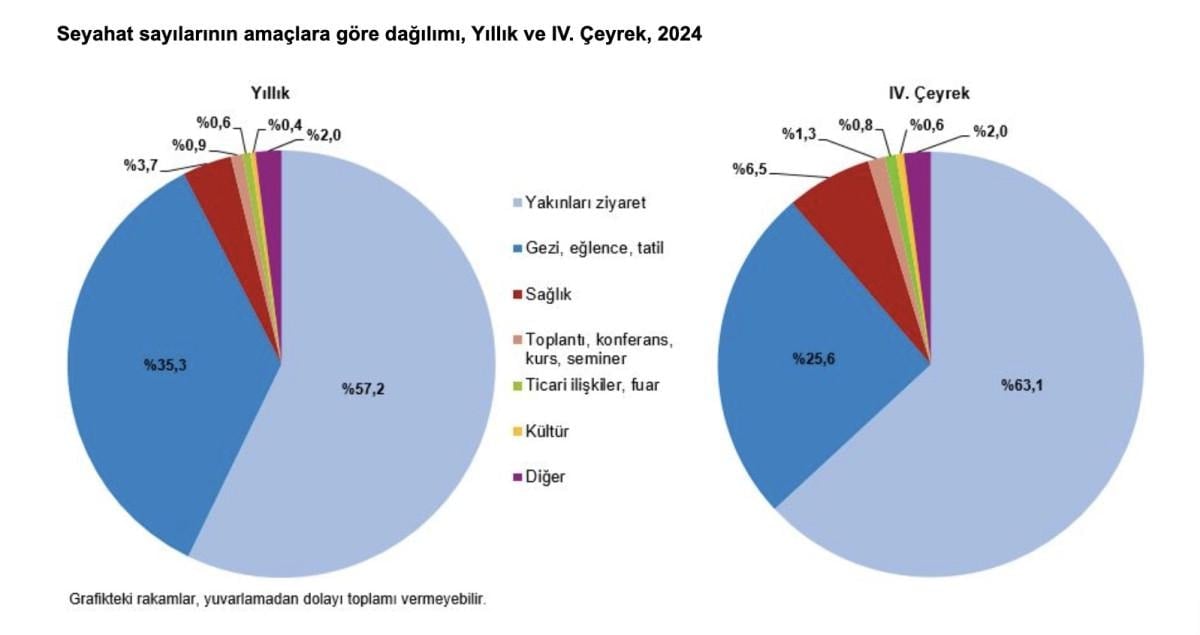 Seyahate çıkış amaçları yıllık olarak değerlendirildiğinde ise, yüzde 57,2 ile "yakınları ziyaret' birinci sırada yer alırken, ikinci sırada yüzde 35,3 ile "gezi, eğlence, tatil", üçüncü sırada ise yüzde 3,7 ile "sağlık" amacıyla yapılan seyahatler yer aldı.
