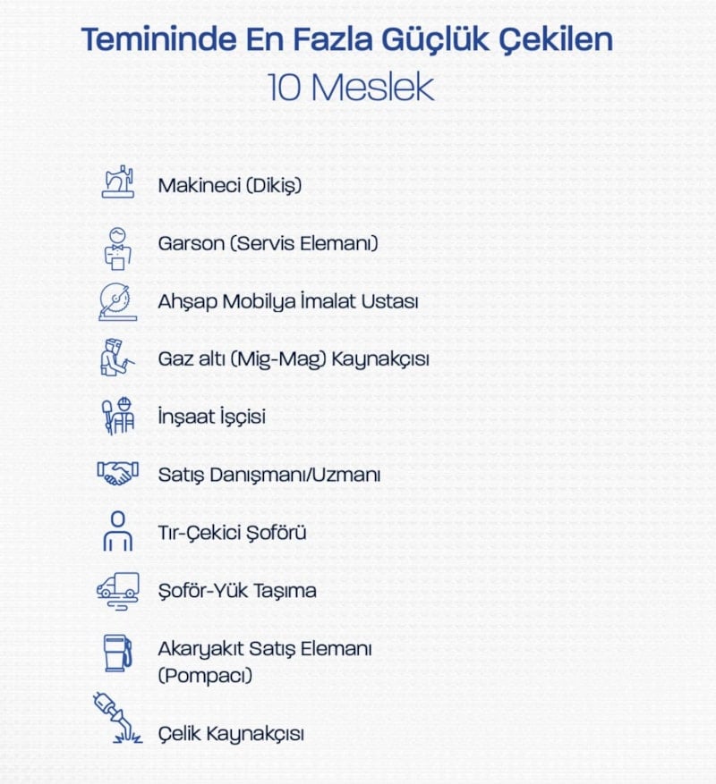 Araştırmada, işverenlerin yüzde 12,5'inin eleman temininde güçlük çektiği saptandı. Eleman temininde en fazla güçlük çekilen 10 meslek, makineci (dikiş), garson, ahşap mobilya imalat ustası, gazaltı kaynakçısı, inşaat işçisi, satış danışmanı, tır-çekici şoförü, yük taşıma şoförü, akaryakıt satış elemanı ve çelik kaynakçısı olarak sıralandı.
