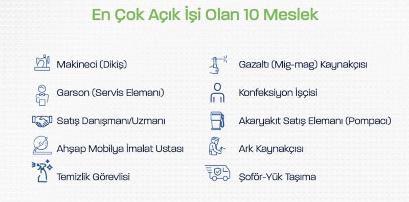 Araştırma kapsamında işverenler tarafından en fazla eleman aranan meslekler de belirlendi. En çok açık iş olan 10 meslek arasında, makineci (dikiş), garson, satış danışmanı, ahşap mobilya imalat ustası, temizlik görevlisi, gazaltı kaynakçısı, konfeksiyon işçisi, akaryakıt satış elemanı, ark kaynakçısı ve yük taşıma şoförü yer aldı.