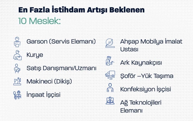 En fazla istihdam artışı beklenen 10 meslek arasında garson, kurye, satış danışmanı, makineci (dikiş), inşaat işçisi, ahşap mobilya imalat ustası, ark kaynakçısı, yük taşıma şoförü, konfeksiyon işçisi ve ağ teknolojileri meslekleri gösterildi.