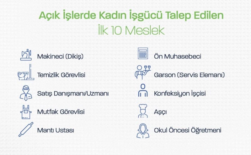 Kadın iş gücü tercih edilen açık işlerde, makineci (dikiş), temizlik görevlisi, satış danışmanı, mutfak görevlisi, mantı ustası, ön muhasebeci, garson, konfeksiyon işçisi, aşçı ve okul öncesi öğretmeni meslekleri öne çıktı.