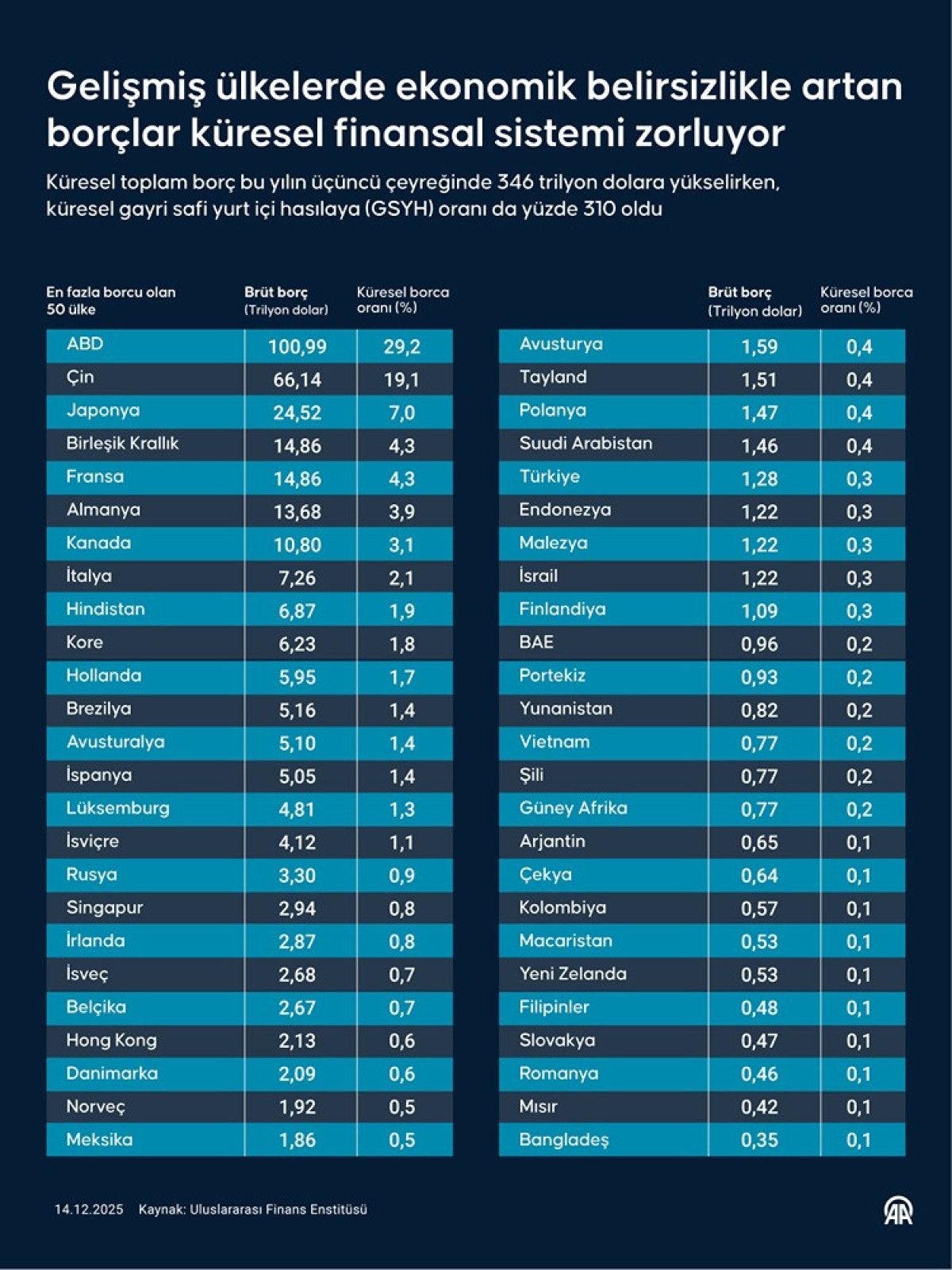 Uluslararası Finans Enstitüsü'nün (IIF) "Küresel Borç Monitörü" raporuna göre, küresel toplam borç bu yılın üçüncü çeyreğinde yaklaşık 346 trilyon dolara yükseldi.