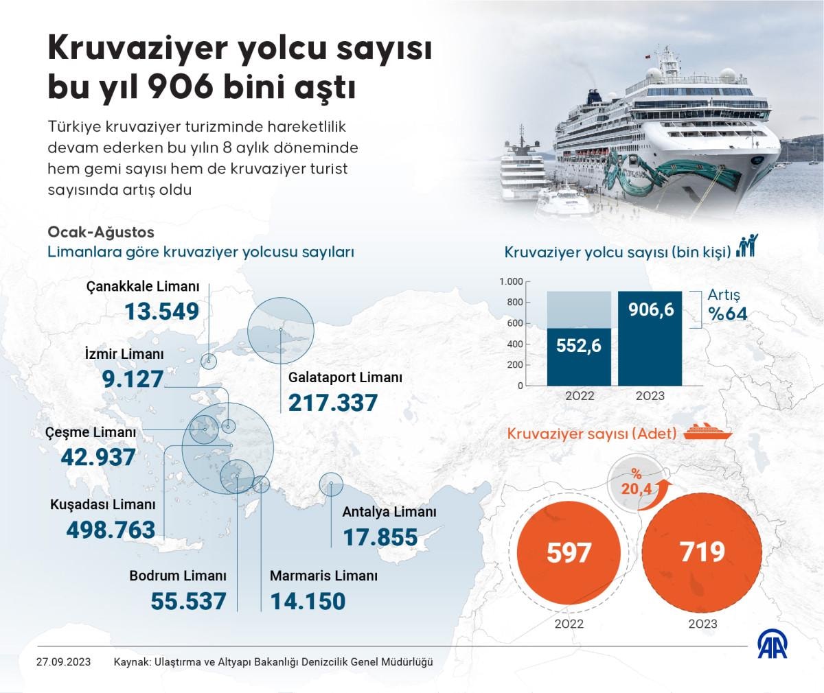 Ulaştırma ve Altyapı Bakanlığı Denizcilik Genel Müdürlüğü verilerine göre, geçen yılın ocak-ağustos döneminde limanlara 597 kruvaziyer yanaşırken bu yılın aynı döneminde gemi sayısı yüzde 20,4 artışla 719'a çıktı.