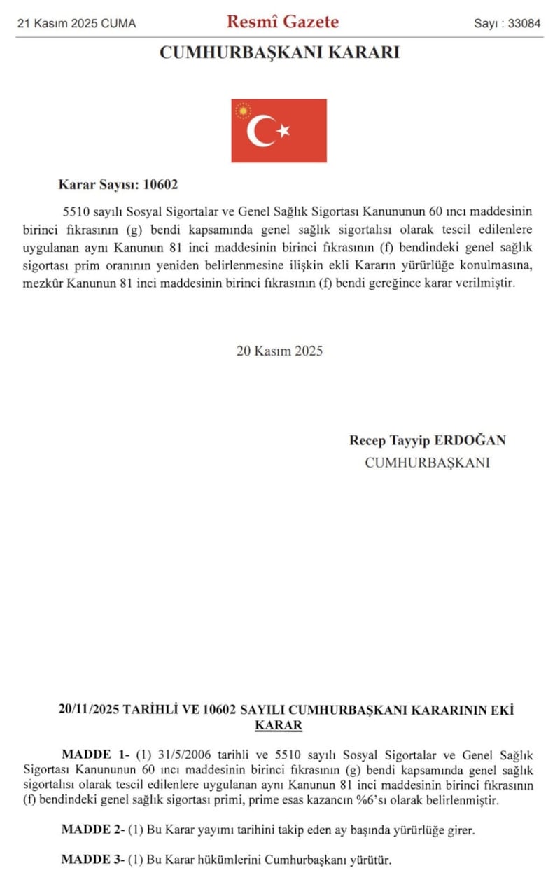 20/11/2025 tarihli ve 10602 sayılı Cumhurbaşkanı kararının eki karar maddeye göre, 31/5/2006 tarihli ve 5510 sayılı Sosyal Sigortalar ve Genel Sağlık Sigortası Kanunu'nun 60 inci maddesinin birinci fıkrasının (g) bendi kapsamında genel sağlık sigortalısı olarak tescil edilenlere uygulanan aynı Kanunun 81'inci maddesinin birinci fıkrasının (f) bendindeki genel sağlık sigortası primi, prime esas kazancın yüzde 6'sı olarak belirlendi.