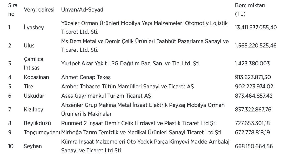 Listede, İlyasbey Vergi Dairesine kayıtlı Yüceler Orman Ürünleri Mobilya Yapı Malzemeleri Otomotiv Lojistik Ticaret Limited Şirketi, 13 milyar 411 milyon 637 bin lirayla ilk sırada yer aldı. Bu şirketi 1 milyar 565 milyon 221 bin lirayla Ms Dem Metal ve Demir Çelik Ürünleri Taahhüt Pazarlama Sanayi ve Ticaret Limited Şirketi ve 1 milyar 423 milyon 380 bin lirayla Yurtpet Akar Yakıt LPG Dağıtım Paz. San. ve Tic. Ltd. Şti izledi.