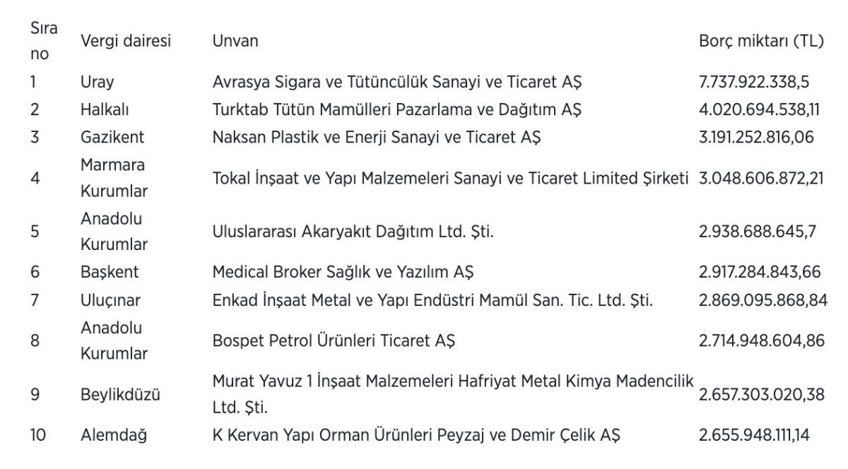 Borçlular listesinin ilk sırasında, 7 milyar 737 milyon 922 bin lirayla Uray Vergi Dairesine kayıtlı Avrasya Sigara ve Tütüncülük Sanayi ve Ticaret AŞ yer aldı.