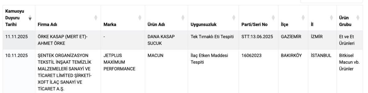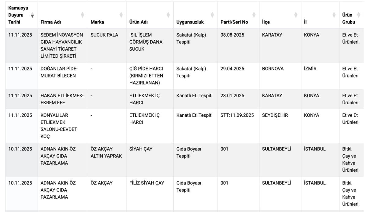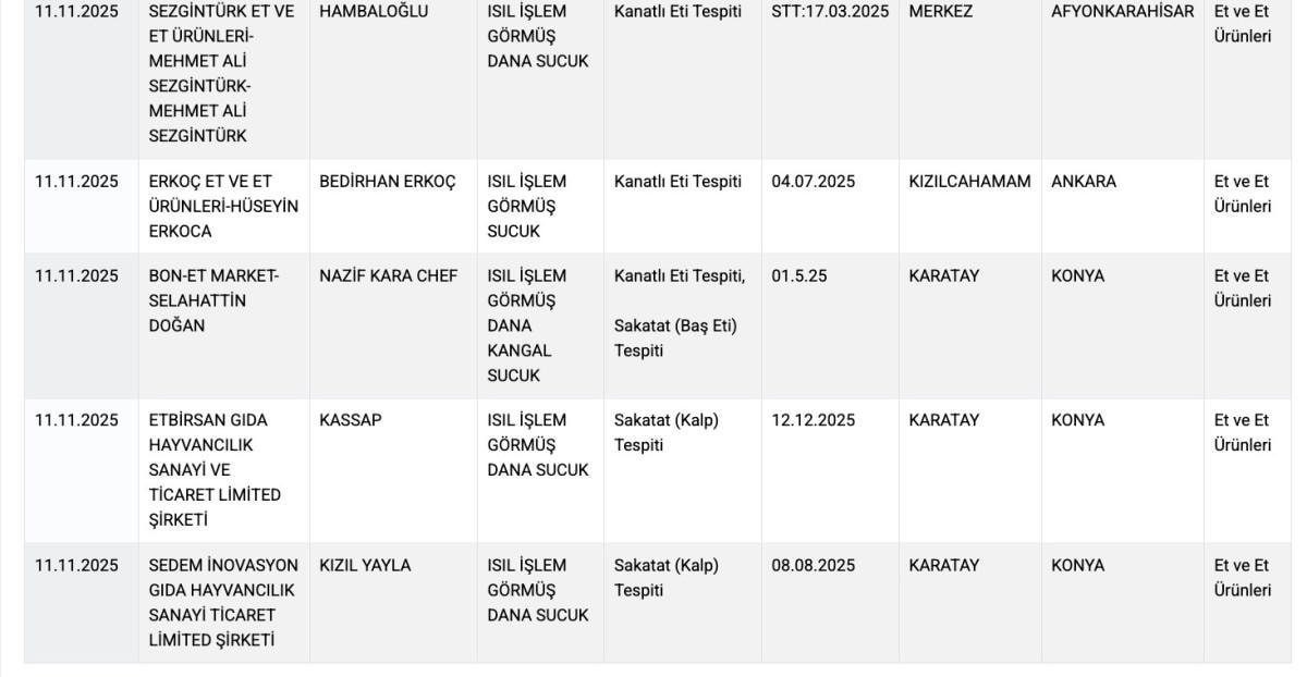 - Listeye eklenen ürünlerde at eti, sakatat ve gıda boyası gibi yasaklı maddeler bulundu.