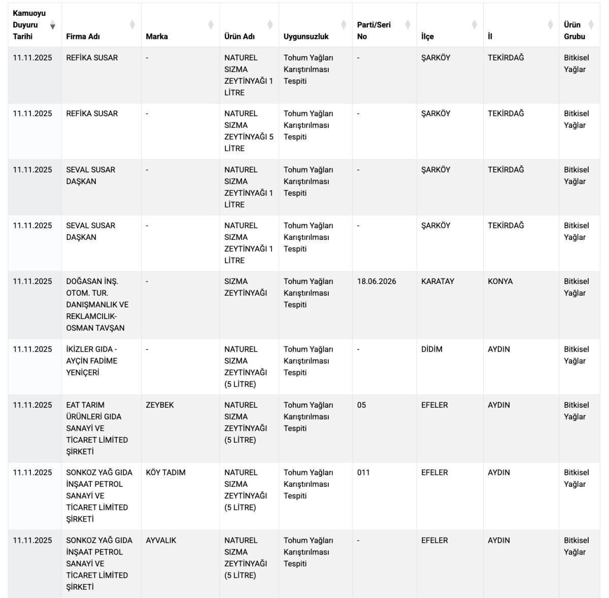 Taklit ya da tağşiş yapılan gıda listesi ise bitkisel yağlara tohum yağlarının karıştırıldığı görüldü.