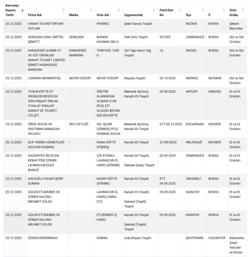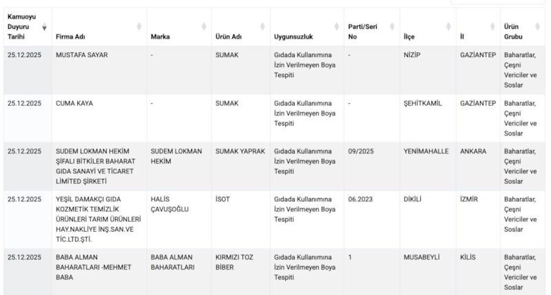 Tarım ve Orman Bakanlığı, “Sağlığı Tehlikeye Düşüren Gıdalar” listesini güncelledi. Sumak, isot ve kırmızı biberde boya tespit edilirken; köfte, sucuk ve etli ekmek iç harcında kanatlı eti ve sakatat kullanıldığı belirlendi.