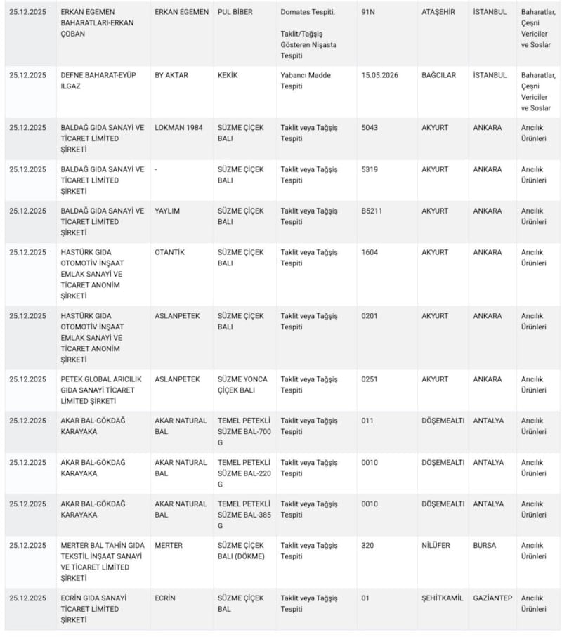 "Taklit veya Tağşiş Yapılan Gıdalar" listesinde ise şekerli mamuller, süt ve süt ürünleri, et ve et ürünleri, baharatlar, arıcılık ürünlerinde hileler yapıldı.