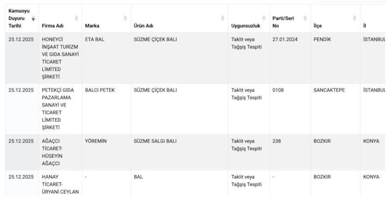Süzme çiçek balında taklit veya tağşiş tespit edildi.