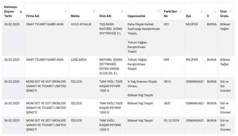 Bu listede naturel sızma zeytinyağına, tohum yağları ve daha düşük kaliteli zeytinyağı karıştırıldı.