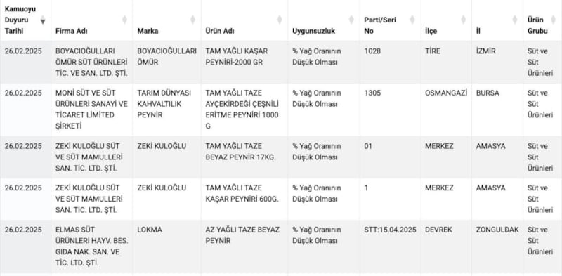 Burada da tüm yağlı kaşar peynirinde, tam yağlı ayçekirdeği çeşnili eritme peynirinde ve tam yağlı beyaz peynirde yağ oranı düşük çıktı.