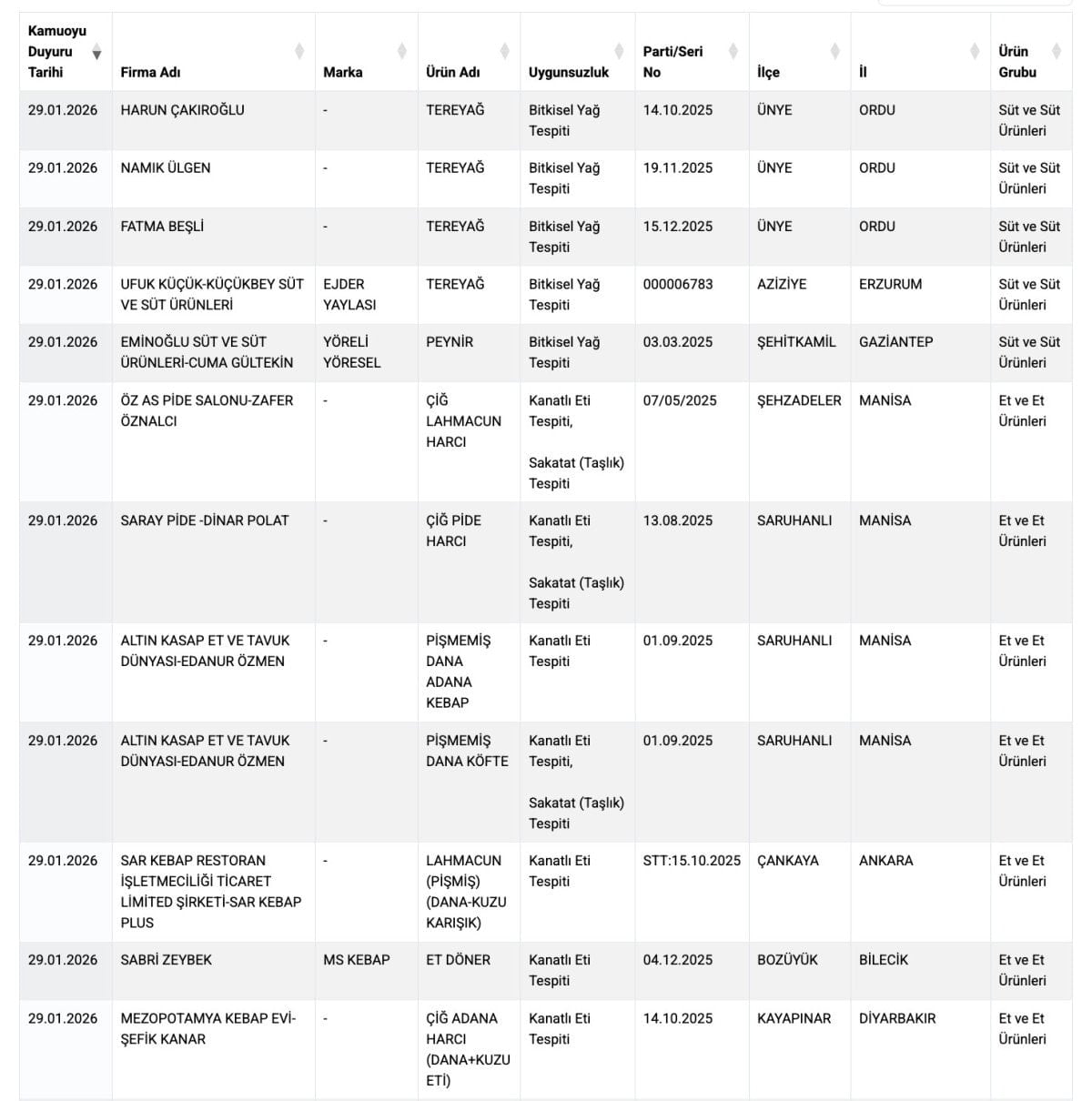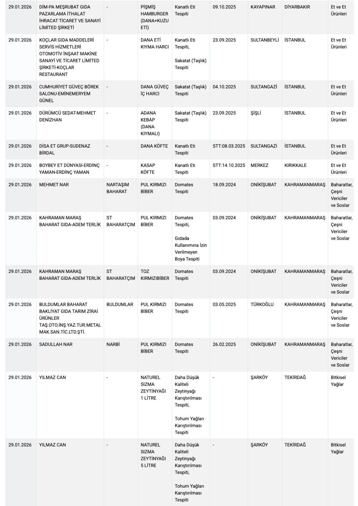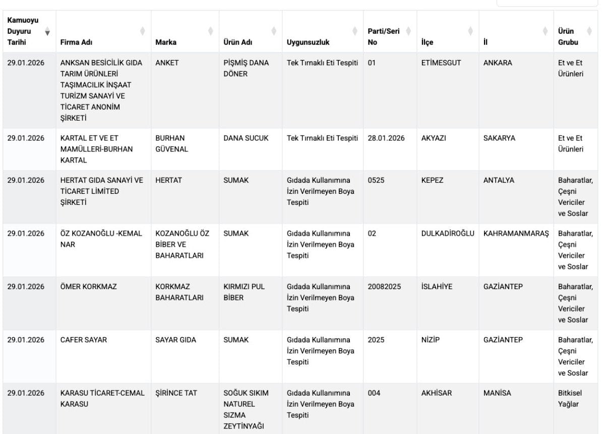 Tarım ve Orman Bakanlığı’nın 29 Ocak 2026 tarihli kamuoyu duyurusunda, et ve et ürünleri ile baharat ve bitkisel yağ grubunda yer alan çok sayıda üründe mevzuata aykırı uygulamalar tespit edildi. Denetimlerde, et ürünlerinde tek tırnaklı eti kullanımı belirlenirken, baharat ve zeytinyağında ise gıdada kullanımına izin verilmeyen boya maddelerine rastlandı.